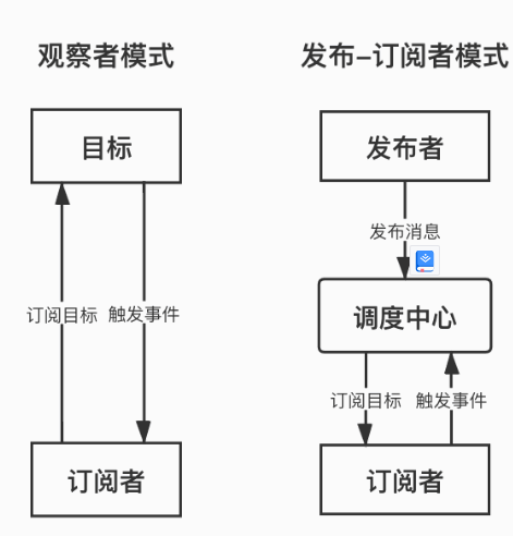 观察者模式是由具体目标调度的,而发布-订阅模式是统一由调度中心调的