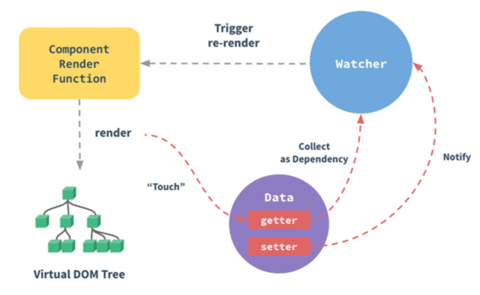 每个组件都对应一个 Watcher 订阅者。当每个组件的渲染函数被执行时,都会将本组件的 Watcher 放到自己所依赖的响应式数据的订阅者列表里,这就相当于完成了订阅,一般这个过程被称为依赖收集(Dependency Collect)。 组件渲染函数执行的结果是生成虚拟 DOM 树(Virtual DOM Tree),这个树生成后将被映射为浏览器上的真实的 DOM 树,也就是用户所看到的页面视图。 当响应式数据发生变化的时候,也就是触发了 setter 时,setter 会负责通知(Notify)该数据的订阅者列表里的 Watcher,Watcher 会触发组件重渲染(Trigger re-render)来更新(update)视图。